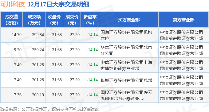 12月17日可川科技现5笔折价14.14%的大宗交易 合计成交1252.83万元