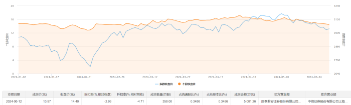 6月12日大宗交易成交358万股,成交额5001.26万元,占当日总成交额的47.83%,成交价13.97元,较市场收盘价14.4元折价2.99%。