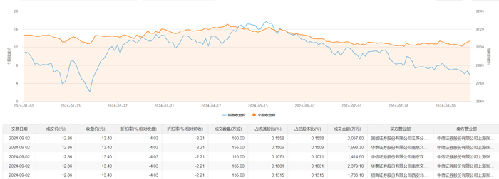 9月2日大宗交易成交745万股,成交额9580.7万元,占当日总成交额的49.33%,成交价12.86元,较市场收盘价13.4元折价4.03%。