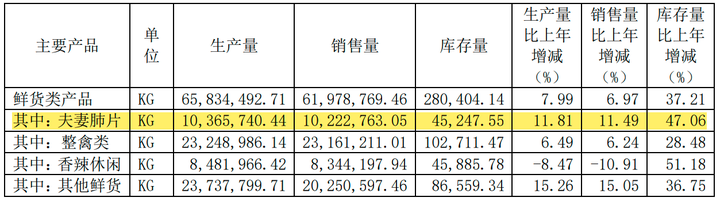 2022年,紫燕食品鲜货类产品生产量同比增长8%,销量同比增长7%,但库存量同比增长了37%,其中,夫妻肺片的库存量更是同比增长了47%。而香辣休闲产品的销量下滑约11%,库存大增51%。整禽类和其他鲜货的库存量增速也均高于销量增速。