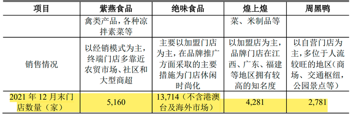 绝味食品和煌上煌主要采取特许加盟的方式,以单体加盟店直接加盟为主,直接负责门店培训、管理及监督,直接向加盟门店进行销售。