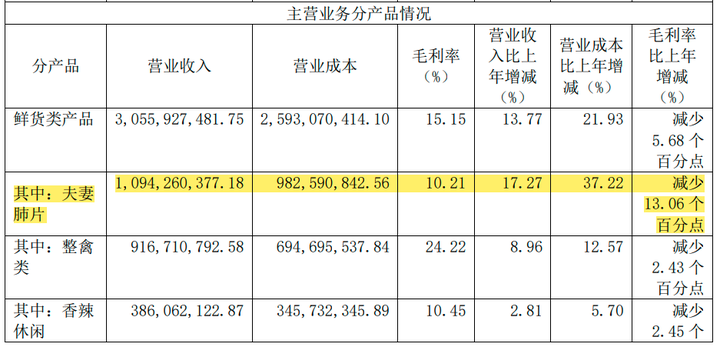 其中,夫妻肺片的营收高达10.94亿元,占总营收的三成左右,占比为30.36%。