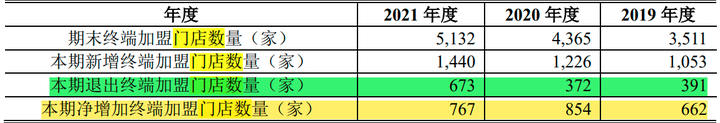 2019—2021年,紫燕食品的加盟、门店管理等年均加盟费用约为1.1万元/年;同期其新增终端加盟门店数量分别为1053家、1226家和1440家,各期退出终端加盟门店数量分别为 391家、372家和673家。