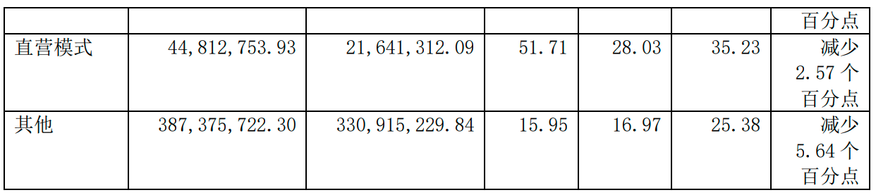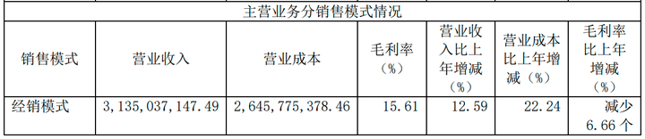 同样,经销模式去年的毛利率也遭遇了下滑,约为15.61%,同比减少6.66个百分点。