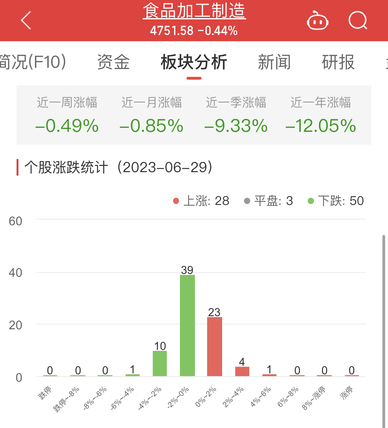 中国经济网北京6月29日讯 今日,食品加工制造板块整体跌幅0.44%,其中,28只股票上涨,3只股票平盘,50只股票下跌。