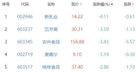 新乳业、五芳斋、安井食品、麦趣尔、绝味食品位列涨幅榜后五位,涨幅分别为-4.11%、-3.59%、-3.43%、-3.19%、-2.86%。