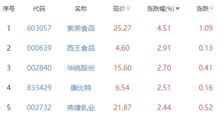 其中,紫燕食品、西王食品、华统股份、康比特、燕塘乳业位列板块涨幅前五位,涨幅分别为4.51%、2.91%、2.70%、2.51%、2.44%。