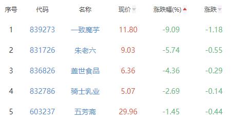 一致魔芋、朱老六、盖世食品、骑士乳业、五芳斋位列涨幅榜后五位,涨幅分别为-9.09%、-5.74%、-4.36%、-2.69%、-1.45%。