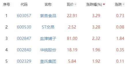 其中,紫燕食品、ST交昂、盐津铺子、华统股份、皇氏集团位列板块涨幅前五位,涨幅分别为3.29%、3.28%、2.32%、1.96%、1.92%。