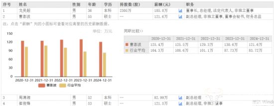 曹澎波身兼数职,可见其能力出众。曹澎波去年薪酬为121.6万元,相较于2023年的130.6万元,下降了9.0万元,是公司三位副总经理中薪酬最高的,比崔俊锋和周清湘分别高了0.1万元、38.61万元。