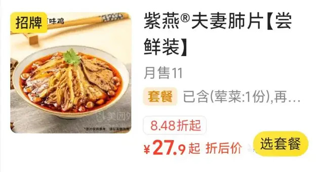 今年11月5日,银莕财经在成都某门店的美团外卖平台上看到,一份“紫燕夫妻肺片【尝鲜装】”显示折后价27.9元。银莕财经询问得知,一份该产品仅80克,若按此价格计算,夫妻肺片的价格将高达348.75元/kg。