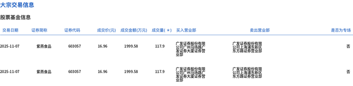 11月7日,紫燕食品大宗交易成交235.8万股,成交额3999.16万元,占当日总成交额的50.45%,成交价16.96元,较市场收盘价18.92元折价10.36%。