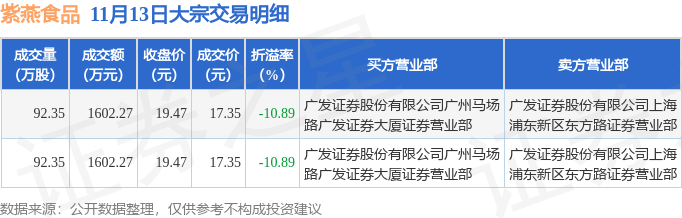 11月13日紫燕食品现2笔折价10.89%的大宗交易 合计成交3204.54万元