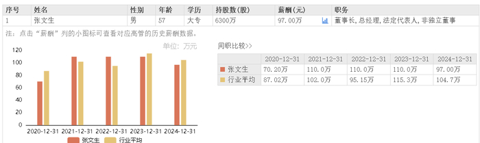 据东方财富网数据,倍加洁董事长兼总经理张文生2024年所获薪酬为97万元,相较上年薪酬110万元降薪13.40%。