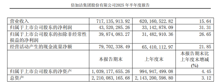 报告显示,倍加洁公司上半年营业收入为7.17亿元,同比增长15.64%;归母净利润为4352.03万元,同比增长31.31%;扣非归母净利润为3987.41万元,同比增长26.65%;基本每股收益0.43元。