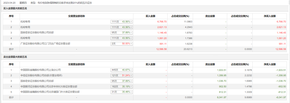 4月20日,金海通今日涨5.41%,龙虎榜数据显示,上榜营业部席位全天成交1.86亿元,占当日总成交金额比例为30.52%。其中,买入金额为1.26亿元,卖出金额为6041.97万元,合计净买入6544.61万元。具体来看,机构合计净买入1.04亿元。此外,国泰君安证券总部、广发证券江门万达广场证券营业部分别买入1146.45万元、991.11万元;中国国际金融上海分公司、中信证券总部(非营业场所)分别卖出1933.51万元、1356.95万元。