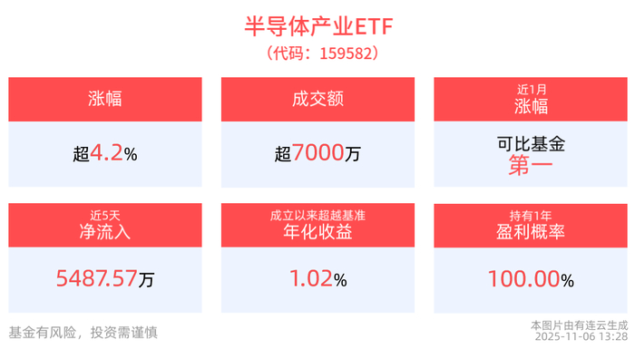 流动性方面,半导体产业ETF盘中换手17.54%,成交7832.75万元,市场交投活跃。拉长时间看,截至11月5日,半导体产业ETF近1月日均成交6668.20万元。
