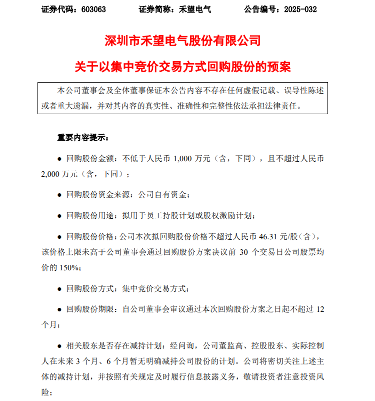 4月11日,禾望电气(603063.SH)公告称,公司拟以自有资金通过集中竞价交易方式回购部分A股股份,用于员工持股计划或股权激励计划。回购金额不低于1000万元,不超过2000万元,回购价格不超过46.31元/股。回购期限自董事会审议通过之日起不超过12个月。