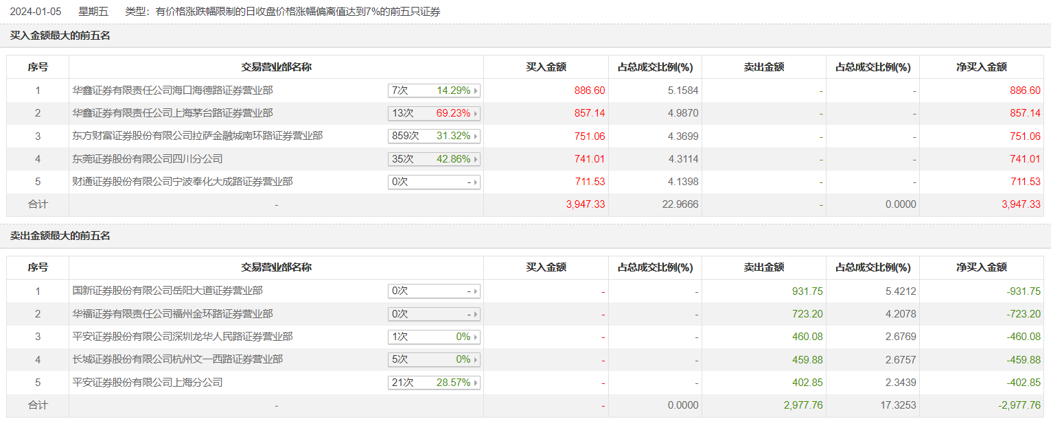 宿迁联盛1月5日涨停,龙虎榜数据显示,上榜营业部席位全天成交6925.09万元,占当日总成交金额比例为40.29%。其中,买入金额为3947.33万元,卖出金额为2977.76万元,合计净买入969.58万元。