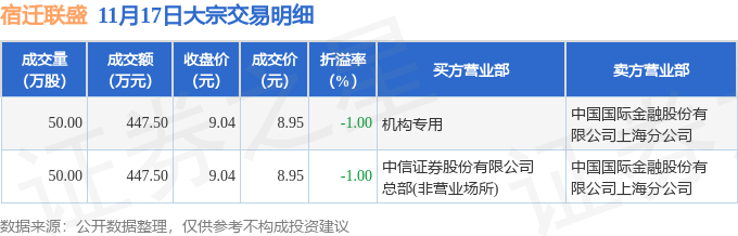 11月17日宿迁联盛现2笔大宗交易 机构净买入447.5万元