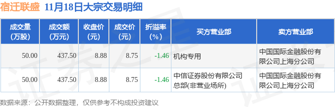 11月18日宿迁联盛现2笔大宗交易 机构净买入437.5万元