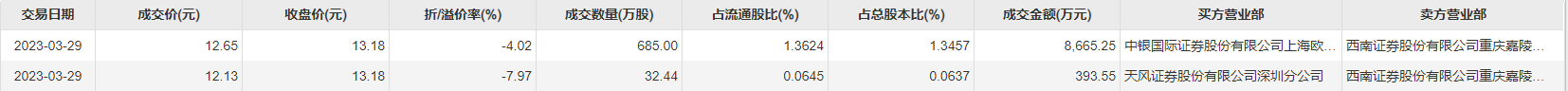 振华股份3月29日大宗交易成交717.44万股,成交额9058.8万元,占当日总成交额的62.9%,成交均价12.63元,较市场收盘价13.18元折价4.17%,其中最高成交价12.65元,最低成交价12.13元。