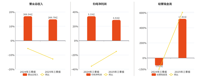 公司营业总收入为269.79亿元,较去年同报告期营业总收入减少39.75亿元,同比较去年同期下降12.84%。归母净利润为4.53亿元,较去年同报告期归母净利润减少8048.16万元,同比较去年同期下降15.10%。经营活动现金净流入为17.81亿元,较去年同报告期经营活动现金净流入增加21.34亿元。