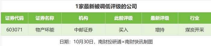 评级调低方面,10月30日,券商调低上市公司评级达到1家次,最新数据包括了中邮证券对物产环能的评级从“买入”调低至“增持”。
