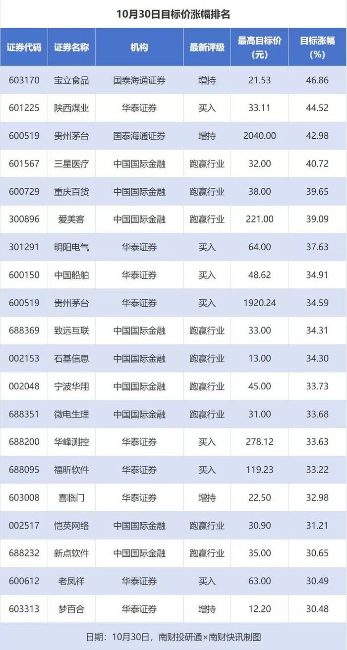 南财投研通数据显示,10月30日,券商给予上市公司目标价共76次,按最新收盘价计算,目标价涨幅排名居前的公司有宝立食品、陕西煤业、贵州茅台,目标价涨幅分别为46.86%、44.52%、42.98%,分别属于调味发酵品、煤炭开采、白酒行业。