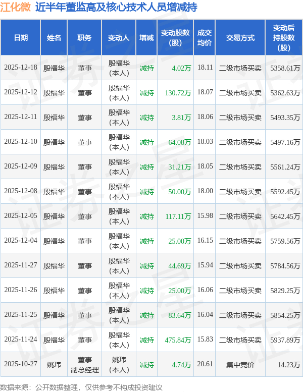 江化微:12月18日高管殷福华减持股份合计4.02万股