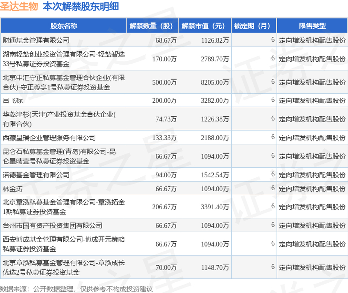 证券之星消息,根据市场公开信息整理,圣达生物(603079)于12月25日将有1784.07万股限售股份解禁,为公司定向增发机构配售股份,占公司总股本9.44%。(本次数据根据历史公告整理得出,实际情况以上市公司最新公告为准)本次解禁后,公司已无限售股份。具体如下图所示: