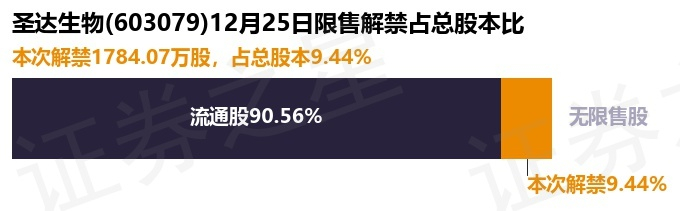 圣达生物(603079)1784.07万股限售股将于12月25日解禁,占总股本9.44%