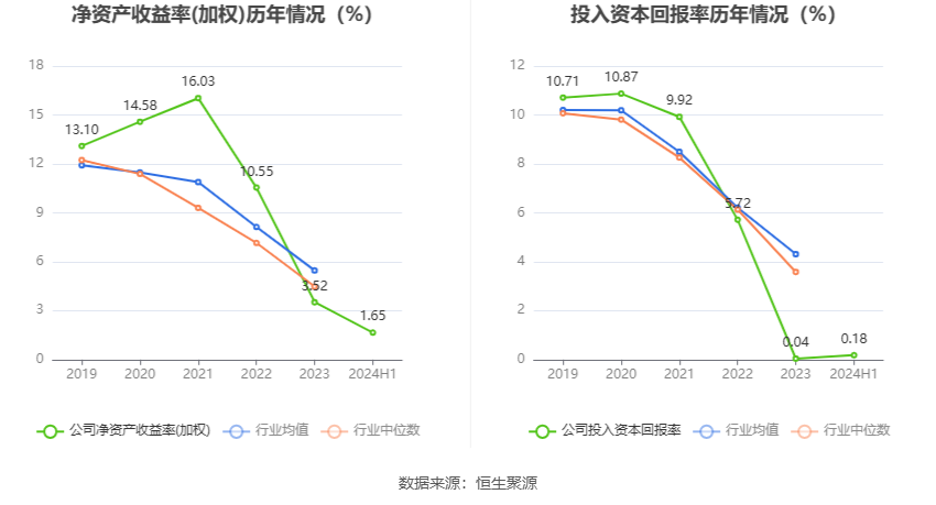 数据显示,2024年上半年公司加权平均净资产收益率为1.65%,较上年同期下降2.53个百分点;公司2024年上半年投入资本回报率为0.18%,较上年同期下降1.62个百分点。