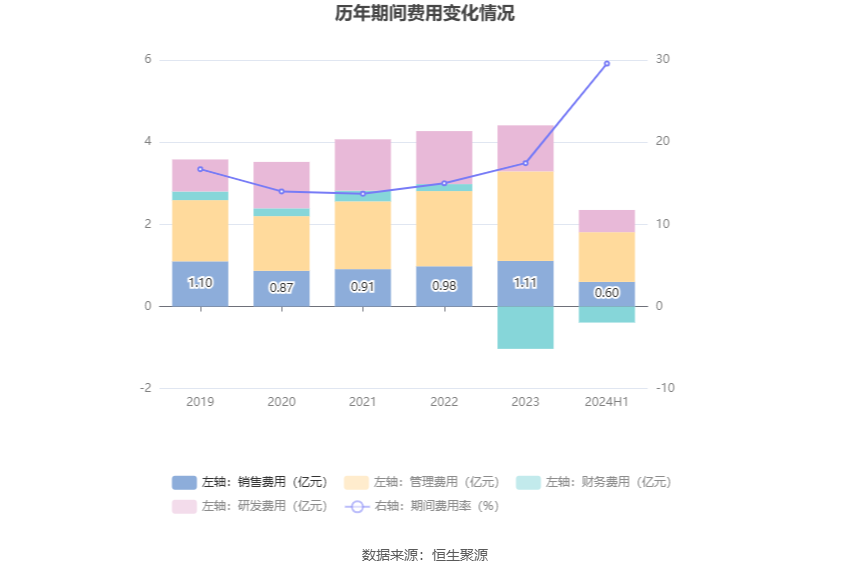 2024年上半年,公司期间费用为1.95亿元,较上年同期增加2999.28万元;期间费用率为29.56%,较上年同期上升15.01个百分点。其中,销售费用同比增长35.14%,管理费用同比增长39.13%,研发费用同比下降15.07%,财务费用由去年同期的-2961.24万元变为-3947.35万元。