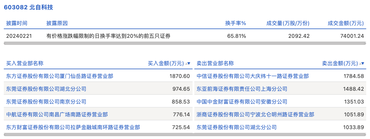2月21日,北自科技今日涨7.56%,龙虎榜数据显示,上榜营业部席位全天成交1.19亿元,占当日总成交金额比例为16.1%。其中,买入金额为5205.46万元,卖出金额为6709.82万元,合计净卖出1504.36万元。