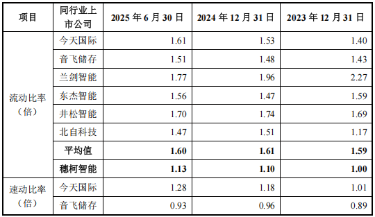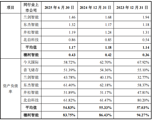 但亮眼业绩背后,穗柯智能的经营风险同样不容忽视。报告期内,尽管穗柯智能资产负债率有所下降,但仍高达83.75%,远超行业合理水平;同时,其短期偿债能力指标(流动比率、速动比率)普遍低于同行业企业,短期资金压力严峻。