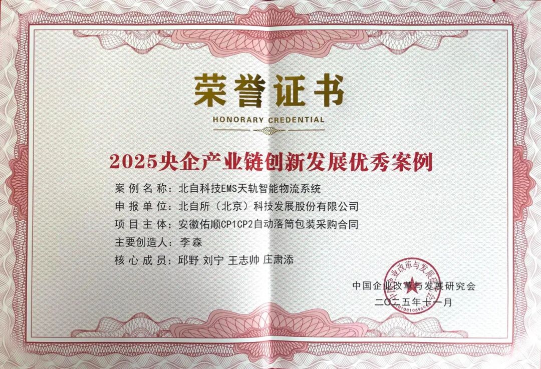 本次论坛正式发布《2025央企产业链创新发展报告》,并宣读了“2025央企产业链创新发展优秀案例”获选名单,北自科技“EMS天轨智能物流系统”项目是中国机械科学研究总院集团有限公司唯一入选案例,标志着北自科技在供应链生态构建方面的实践探索位于央企前列。