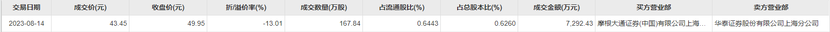 8月14日大宗交易成交167.84万股,成交额7292.43万元,占当日总成交额的5.41%,成交价43.45元,较市场收盘价49.95元折价13.01%。