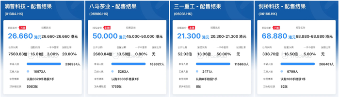 配售结果显示,滴普科技、八马茶叶、三一重工、剑桥科技本次申购人数分别达23.7万、16.8万、11.6万、20.6万人,公开认购分别为7569.83倍、2680.04倍、52.93倍、338.7倍,国配认购分别为16.61倍、13.58倍、13.96倍、16.5倍,一手中签率分别为3%、0.8%、50%、5%。