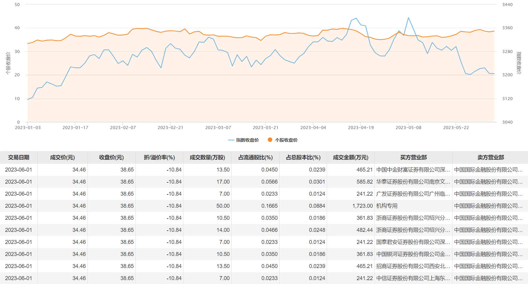 6月1日大宗交易成交150万股,成交额5169万元,占当日总成交额的25.1%,成交价34.46元,较市场收盘价38.65元折价10.84%。