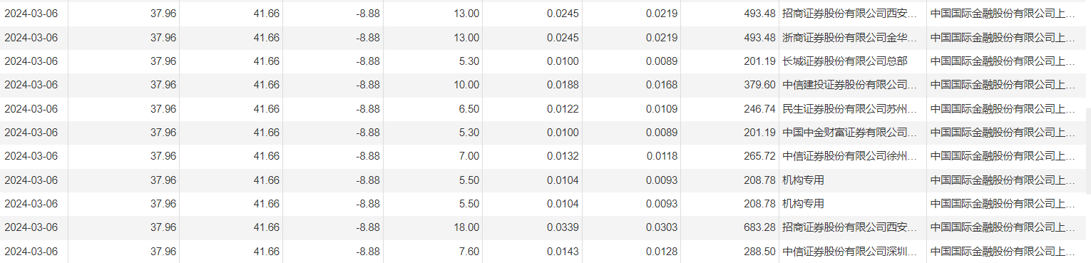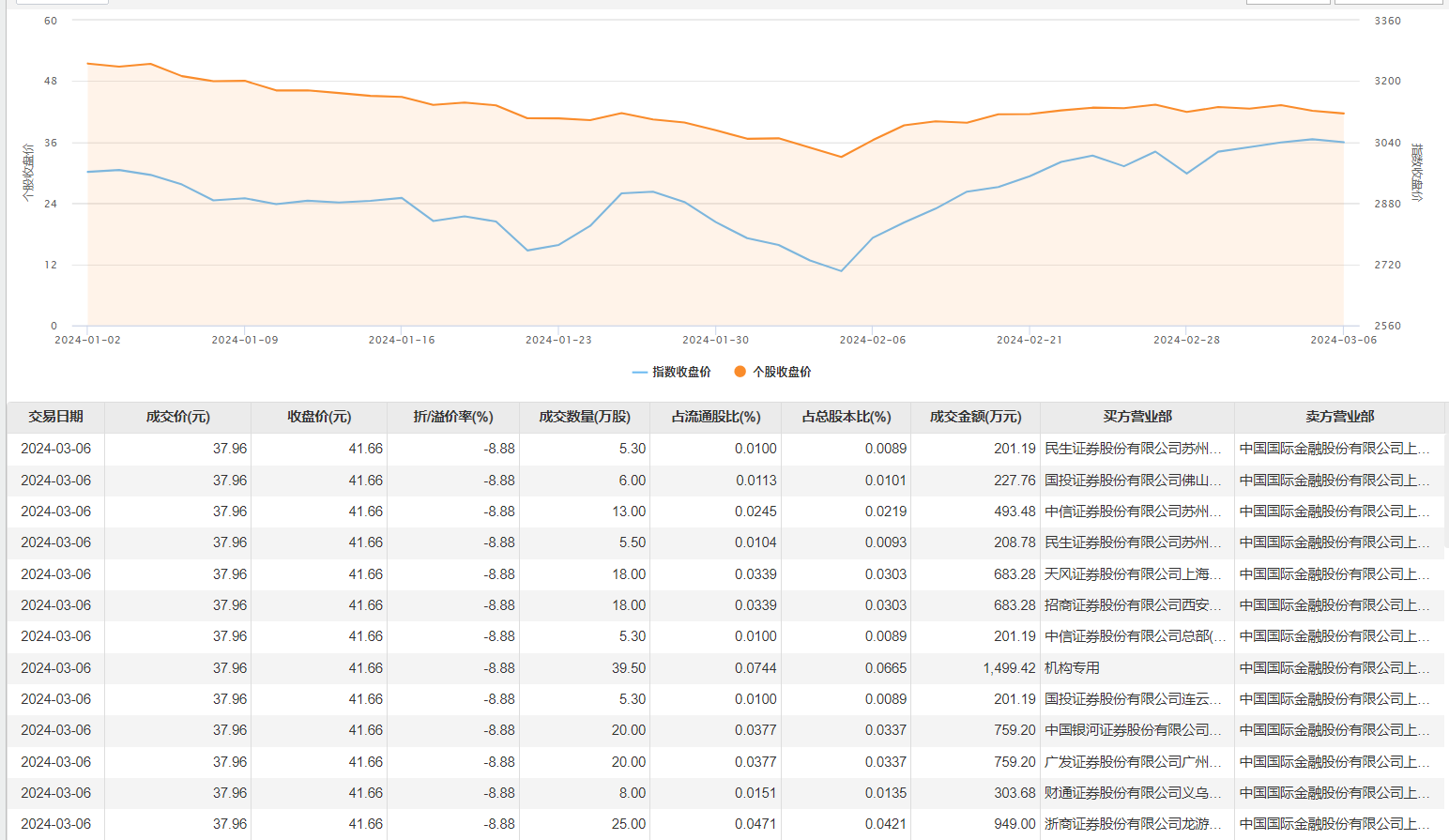 3月6日大宗交易成交485.4万股,成交额1.84亿元,占当日总成交额的34.35%,成交价37.96元,较市场收盘价41.66元折价8.88%。