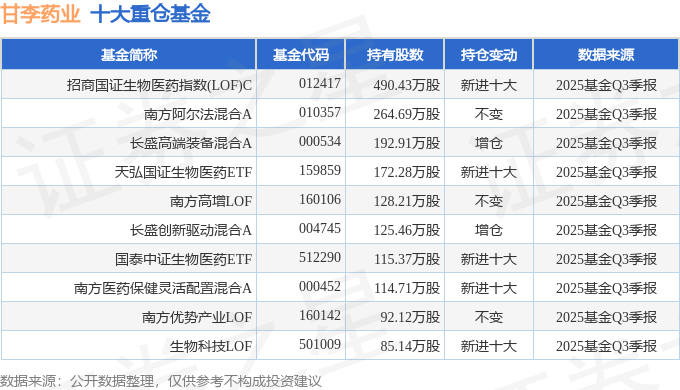 持有甘李药业最多的基金为招商国证生物医药指数(LOF)C,目前规模为15.39亿元,最新净值0.4369(10月31日),较上一交易日上涨2.15%,近一年上涨9.88%。该基金现任基金经理为侯昊 许荣漫。