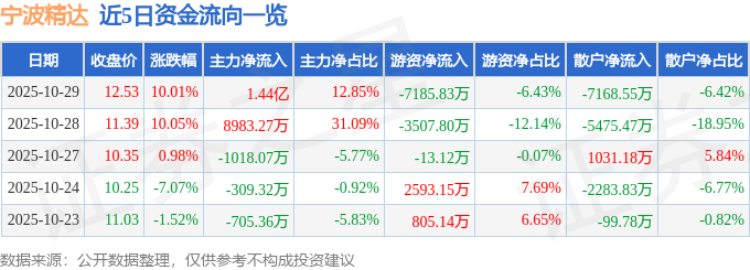 10月29日的资金流向数据方面,主力资金净流入1.44亿元,占总成交额12.85%,游资资金净流出7185.83万元,占总成交额6.43%,散户资金净流出7168.55万元,占总成交额6.42%。