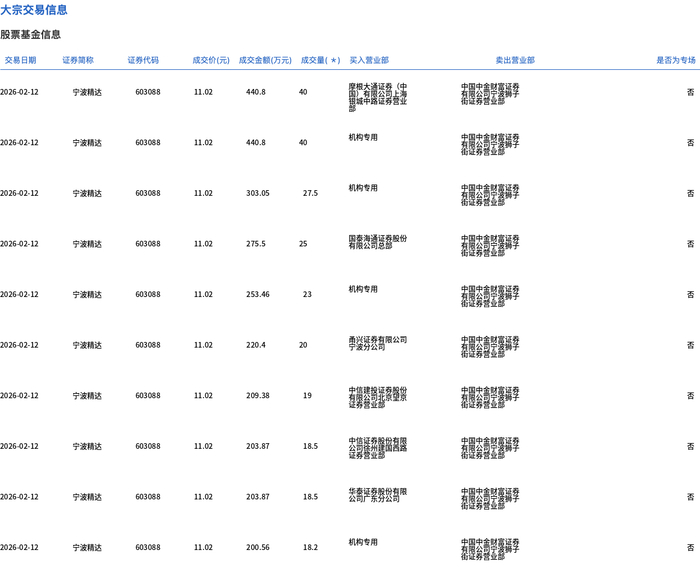 2月12日,宁波精达大宗交易成交294.7万股,成交额3247.59万元,占当日总成交额的7.07%,成交价11.02元,较市场收盘价12.76元折价13.64%。