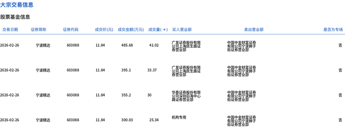 2月26日,宁波精达大宗交易成交129.73万股,成交额1536.01万元,占当日总成交额的2.55%,成交价11.84元,较市场收盘价13.63元折价13.13%。
