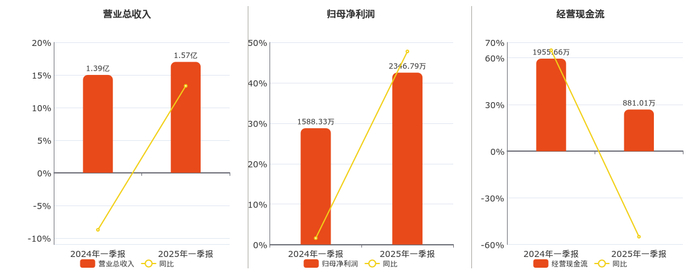 公司营业总收入为1.57亿元。归母净利润为2346.79万元。经营活动现金净流入为881.01万元,较去年同报告期经营活动现金净流入减少1074.65万元,同比较去年同期下降54.95%。