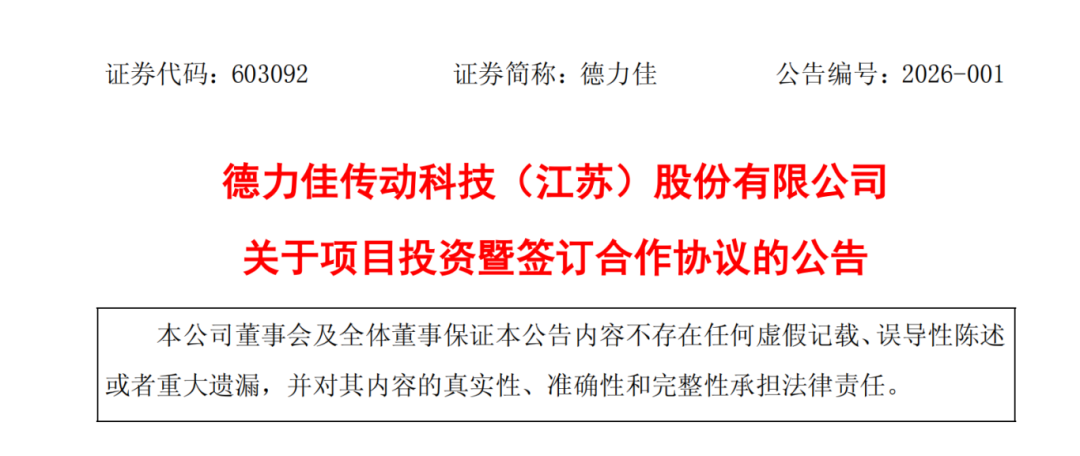 1月26日,德力佳传动科技(江苏)股份有限公司发布《关于项目投资暨签订合作协议的公告》。