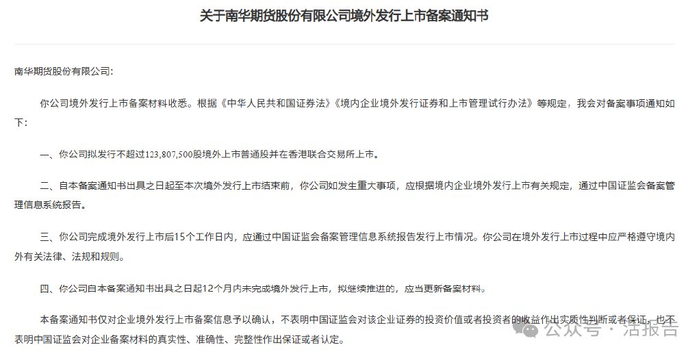 南华期货于9月19日通过备案,拟发行不超过123,807,500股境外上市普通股并在香港联合交易所上市。