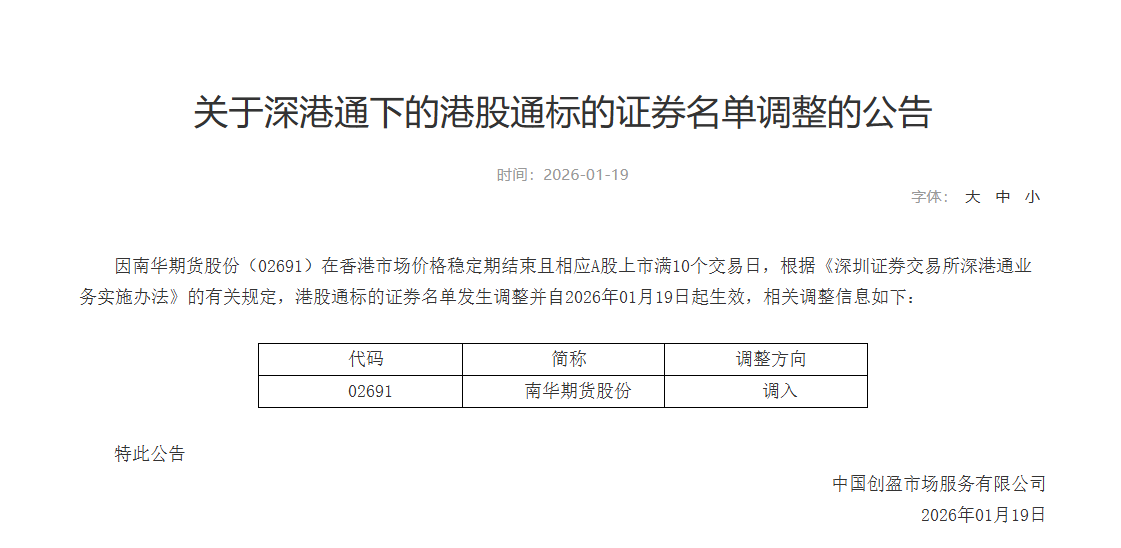 1月19日,深交所发布关于深港通下的港股通标的证券名单调整的公告,宣布南华期货(603093.SH)H股——南华期货股份在香港市场价格稳定期结束且相应A股上市满10个交易日,自2026年1月19日起正式成为港股通标的。这意味着内地投资者可通过港股通,正式投资南华期货H股。