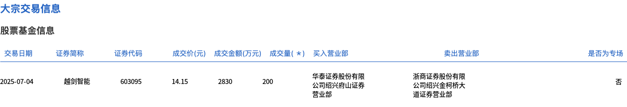 越剑智能今日大宗交易折价成交200万股,成交额2830万元
